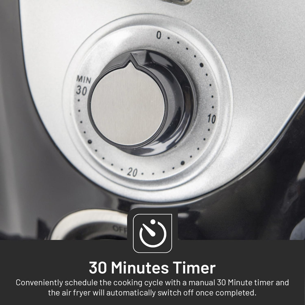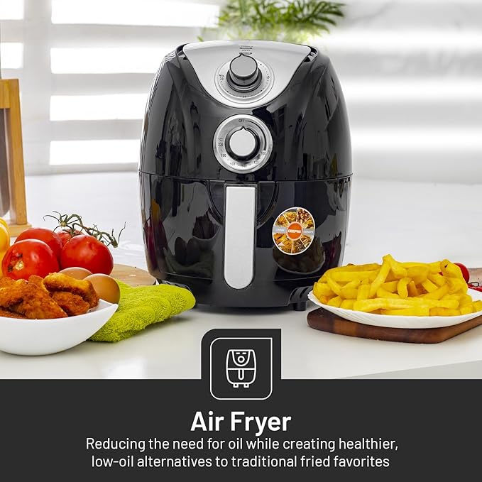 Compact 2.5L air fryer with high-speed air circulation for faster, healthier cooking. Features adjustable temperature (100–200°C), 30-minute timer, non-stick dishwasher-safe parts, durable stainless-steel knobs, and a cool-touch handle for safe, convenient use.