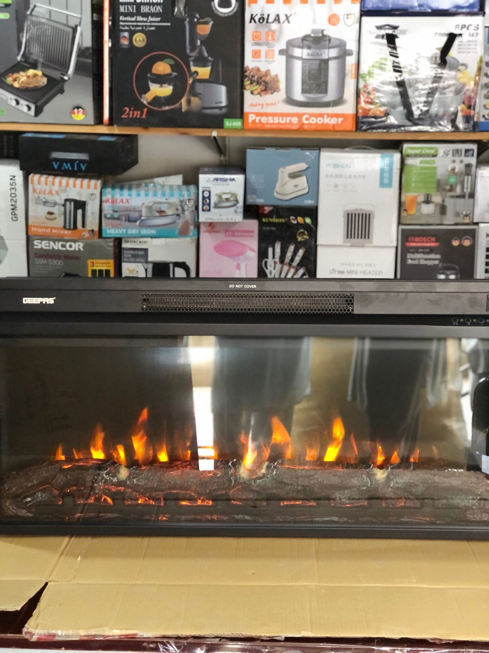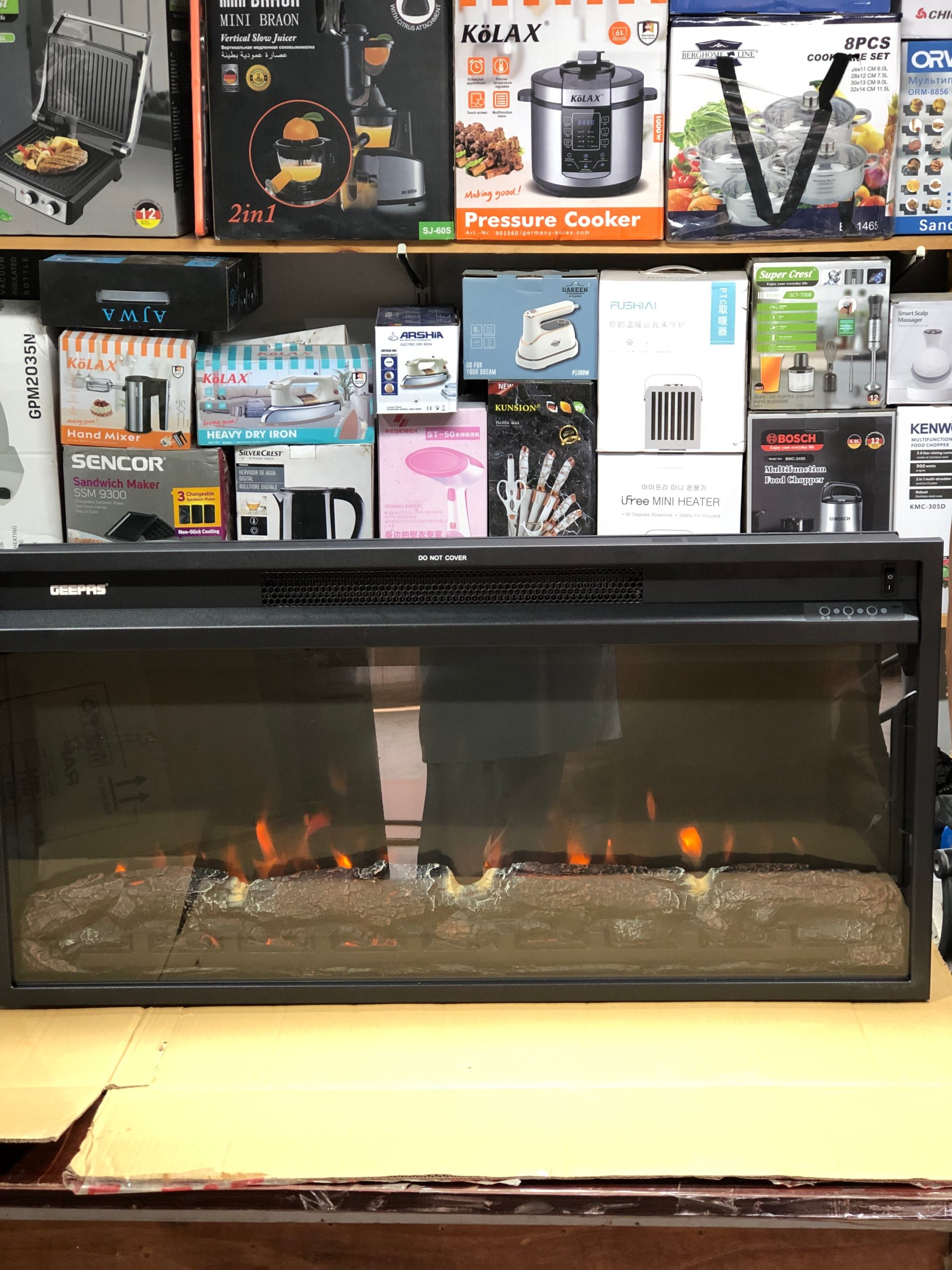 Brand : Geepas Digital display, touch screen 3D simulation flame With remote control 2000W instant heating 12H timer Tip-over protection Over-heating protection Flame-retardant material Ratings: AC220-50/60Hz 2000W 2 Year Warrenty