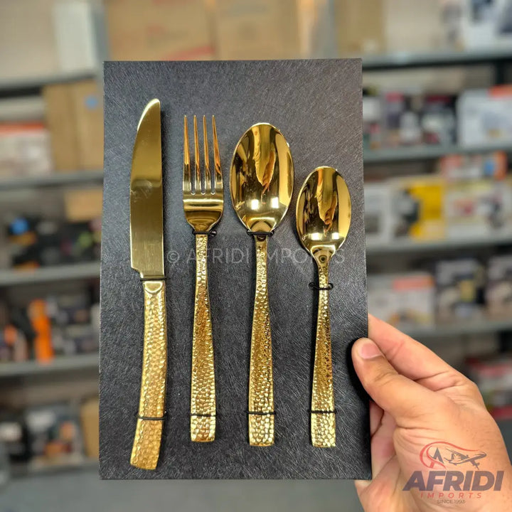 Elegant golden luxury finish Complete 24-piece cutlery set Premium stainless steel material Perfect for formal dining Rust-resistant and durable build Smooth and comfortable grip
