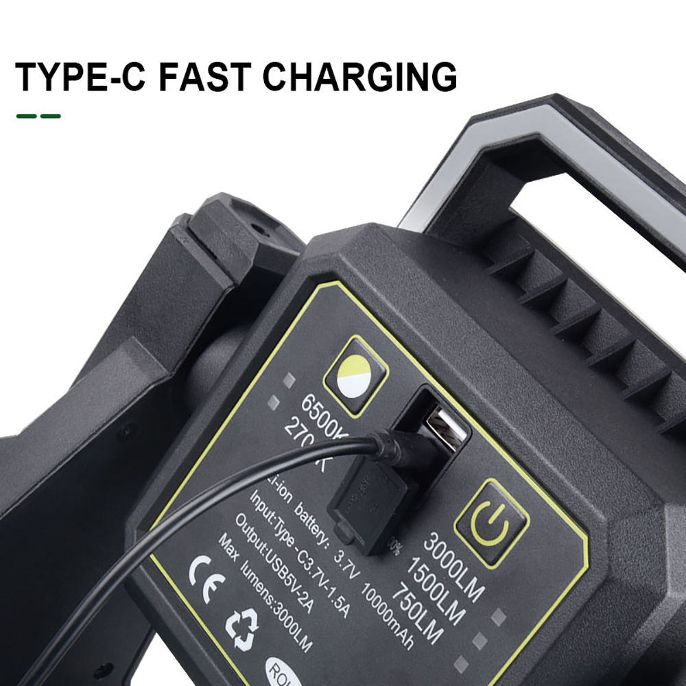 Use of Power Banks and Power DisplaysLong-term illumination requirements can be satisfied by the integrated 10000mAh large-capacity battery. This emergency work light can also be used as a power bank to recharge other devices.