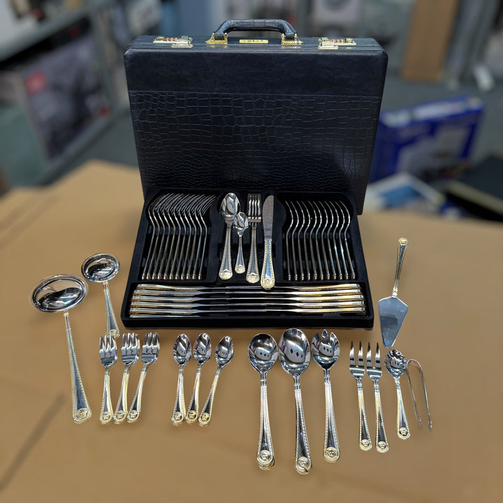 Original Zepter 72-piece Swiss cutlery set Made with premium-grade stainless steel Includes full dinner & tea set for 12 people Comes with meat fork, salad set, soup & gravy ladle Elegant design – perfect for formal dining Rust-resistant, durable & long-lasting finish Packed in a luxury box – ideal for gifting or home use